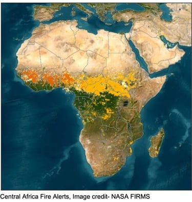 Central Africa: DRC and Angola- In one week of August 2024, the global burned area from wildfires was about 64% higher than any other week since 2012, driven largely by Africa, where around 22 million hectares burned. Angola and the Democratic Republic of the Congo were among the most affected, with large tracts of savanna and forest landscapes burning and contributing a substantial share of the global burned area that week.