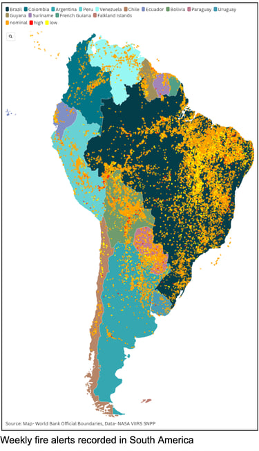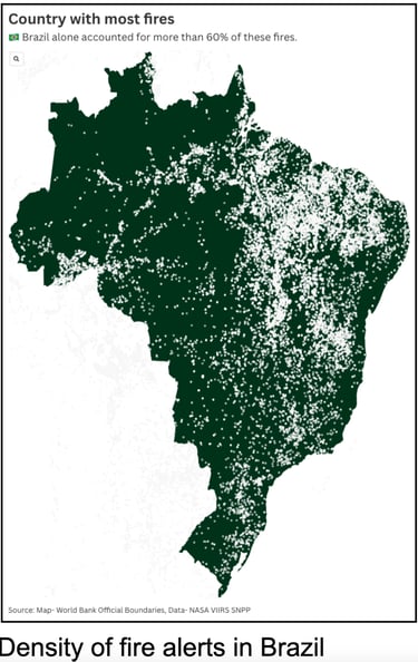 Amazon and Brazil- According to Brazil’s space agency INPE, the Brazilian Amazon recorded about 24,900–20,000+ fire hotspots from January through July 2024, the highest for that period since 2005 and roughly a 76–98% increase compared with 2023, confirming an exceptional fire year. These hotspots align with extensive deforestation and degradation processes, with civil society overflights documenting large areas of burning forest and heavy smoke across key Amazon states.